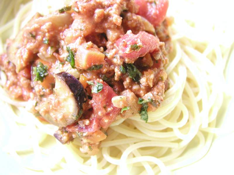 冷凍トマトで作ったミートソースの残りに、冷蔵庫でかさばっている茄子を入れて、休みの日のお昼ご飯。