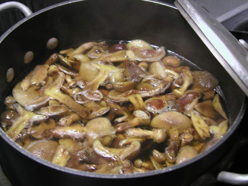 洗ったら水煮にすると、小さな虫が出てくる。気がつかないで食べてしまう程度のものだが、嫌な人はキノコを取り出してから、汁をさらしなどで漉せばいい。この汁に香りと味が出るので、捨ててはもったいない(塩漬けにする場合は別)。
