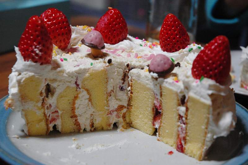 適当にイチゴのスライスと生クリームをはさみながら、ぐるぐるとスポンジを巻いて、周りだけクリームを塗ったところで飾りつけ担当の娘にバトンタッチ。