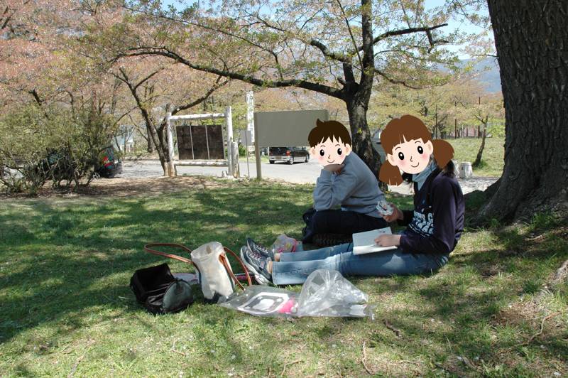 木陰で桜の花びらがはらはら風に乗って散るのを眺めながら、のんびりおにぎりを食べて一休み。