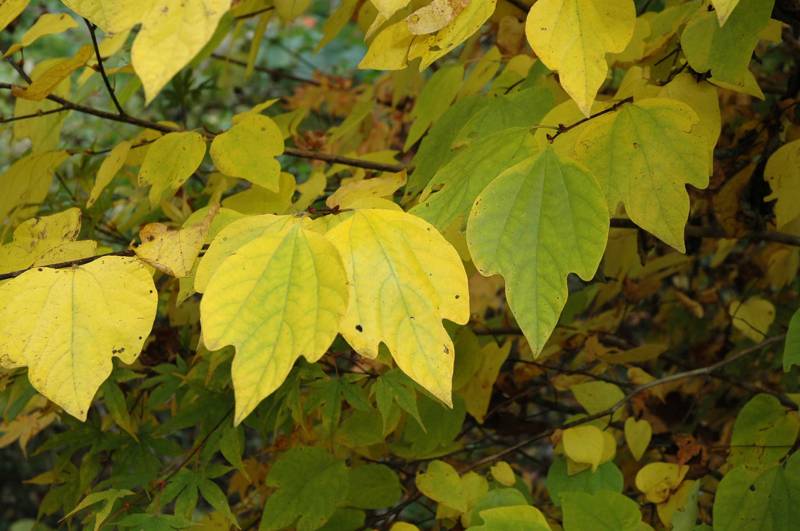 秋の日にまぶしいほどの、見事なツツジの赤。