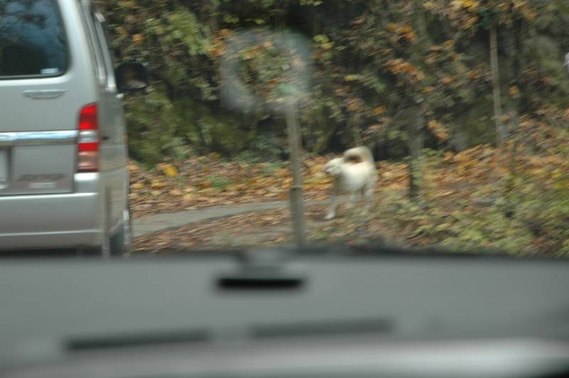 喋りながらも釣り人たちの顔は川を向いている。私はひたすら車のウインドウにオデコをくっつけて、反対側の山の斜面に目を凝らす。