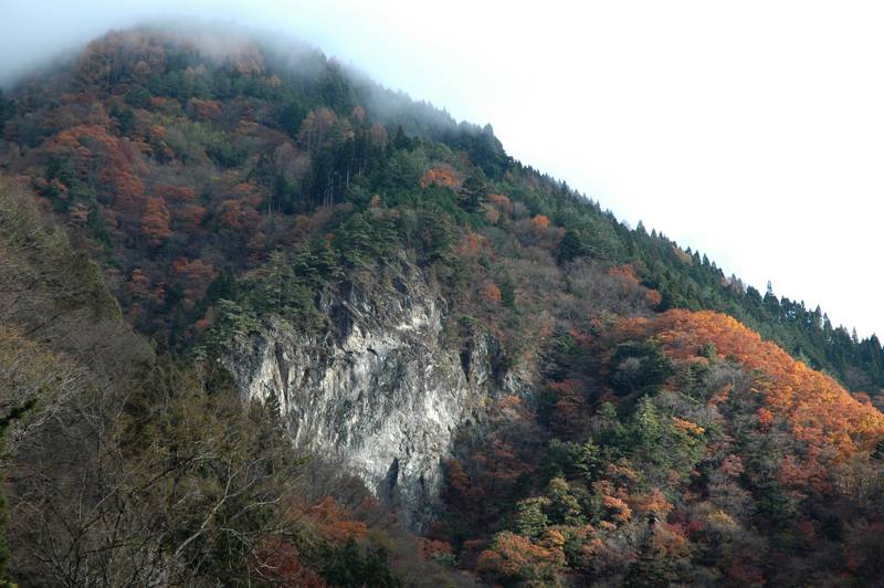 急峻な白い山肌にしがみつく松、周囲の広葉樹のコントラストが美しい。