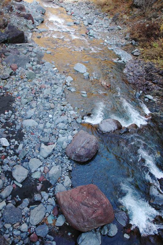 目を引く赤いチャート石が、数十トンクラスのものから小石、砂利サイズまであちらこちらにゴロゴロしている。