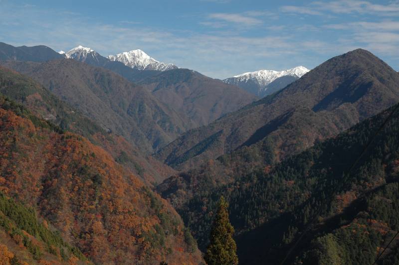 遠山は良く晴れて、青空を背景に十重二十重に重なる深い山と、その背後に美しく白く輝く南アルプスが私たちを出迎える。