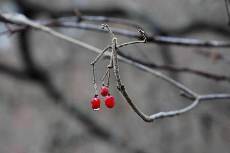 オトコヨウゾメの赤い実が晩秋の雫をまとってきらりと光っている。