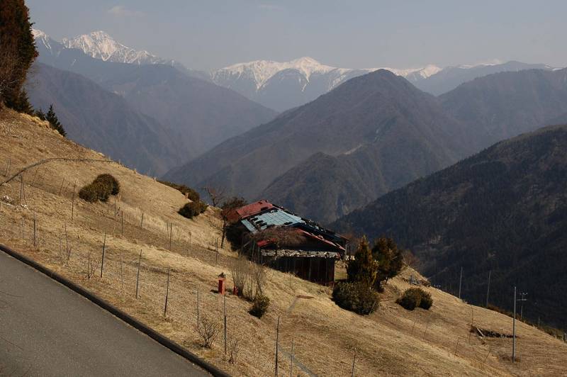 シーズン前でまだ営業していない「ばんば亭」の駐車場に車を入れて、よくガイドブックに出てくる撮影ポイント・「斜面に立つ空き家と南アルプス」を撮影。