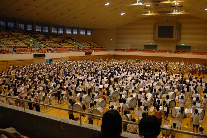 例によって混雑する駐車場に恐れをなして、一時間前に会場に入ったら車寄せもまだ空いていて、スムーズに楽器(でっかいほうのチューバ)とコドモを下ろし、車も駐車場に止めることができた。…しかしそんなことをしている間にもどんどん保護者の車が増え、とても「後で迎えに来るね」とは言えない状況に…。後で迎えに来たら車を止めるところもなさそうだ。仕事の締め切りは迫っているが、もう仕方ないから私も練習に付き合うか。会場に着くまでは、このイベントが小中合同ではなく小学生だけのパレードだと思っていたノンキな私。松本市中の小中の子供+保護者??…そりゃあ、すごい人数になる訳である(本番のパレード人員は3千人余りだそうだ)。