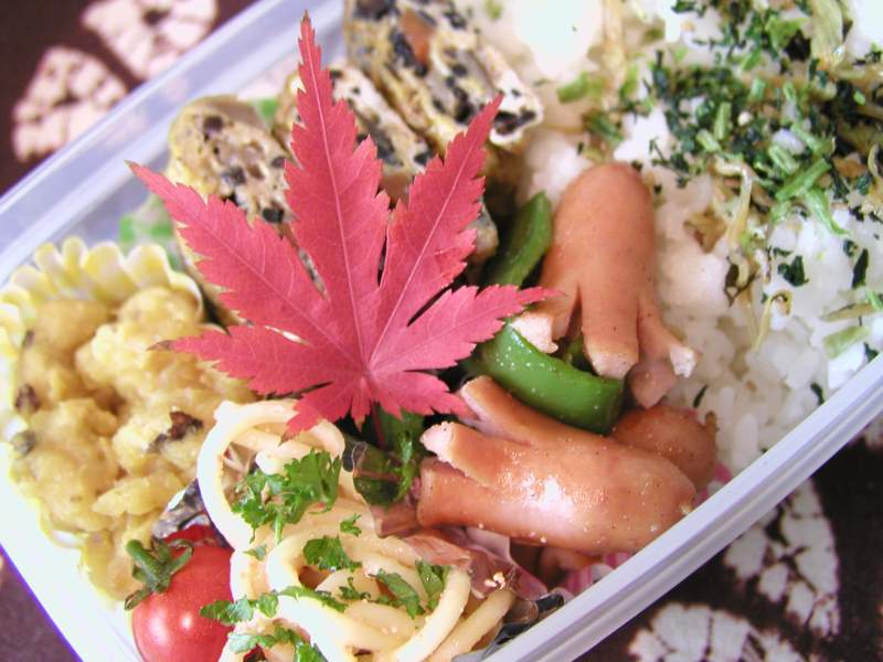 最後に、「木曽らしい弁当、ってなんだろな?」と、庭からモミジの葉のいいところをとってきて、1枚乗せた。
