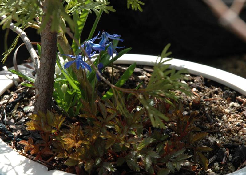 ネコヤナギの鉢の足元の、シラー・シベリカが今年も出ました。4年目かな?とても美しい球根植物です。花も小さくてかわいらしい。地植えにするとうっかり、ふんでしまいそう。