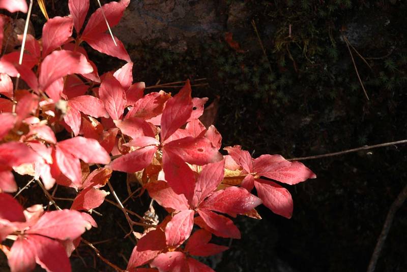 秋の日にまぶしいほどの、見事なツツジの赤。