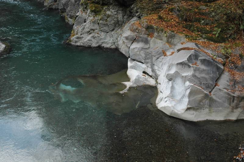 仏島と呼ばれる谷の岩盤の狭窄部分の石は激しい流れで洗われて、面白い肌合いを見せている。