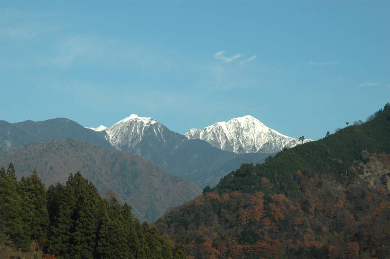 遠山は良く晴れて、青空を背景に十重二十重に重なる深い山と、その背後に美しく白く輝く南アルプスが私たちを出迎える。