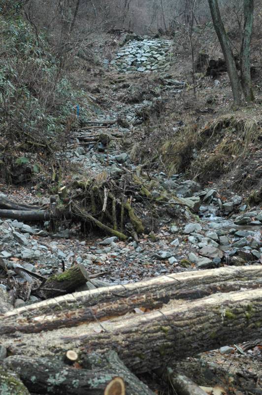 川沿いに設けられた山道の土留めに目が行く。