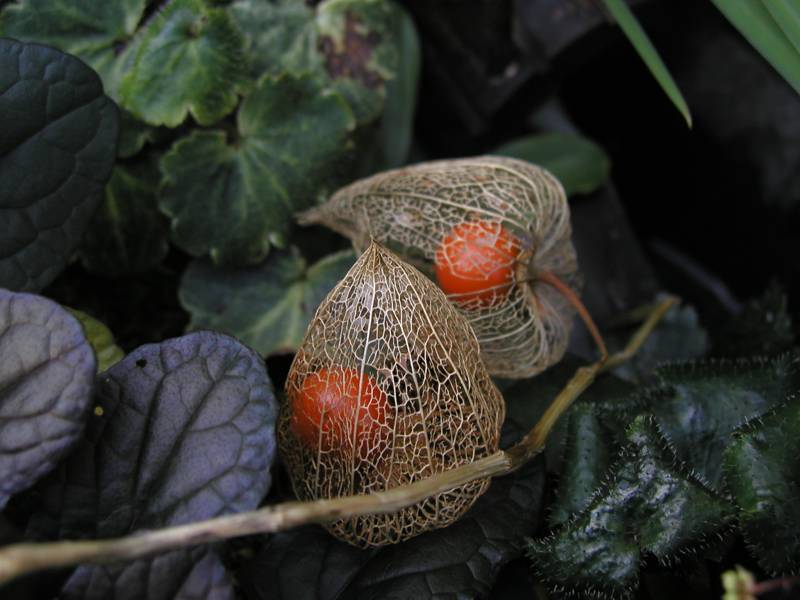 このほおずき、地面においておくと誰のしわざかわからないが、固い脈の部分だけを残してまるで品の良い電灯の囲いのごとき芸術品が出来上がる。