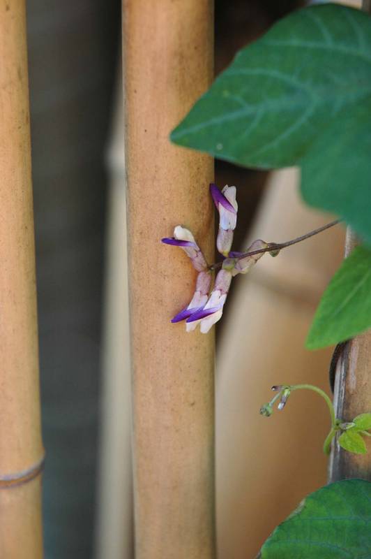 誰が持ってきたんだか、ある夏の日に玄関脇の地面から、どう見ても恐怖のマメ科らしいツルが出て、あれよあれよと伸びて、まあ良いやと竹垣に登らせておいたら9月の終わりに美しい花が咲いた。